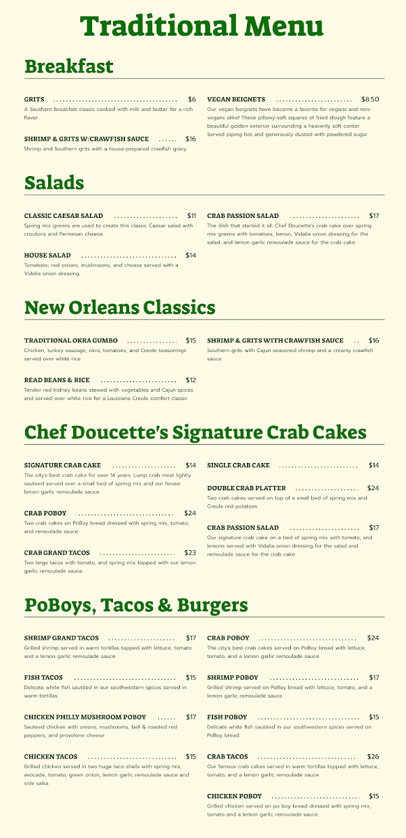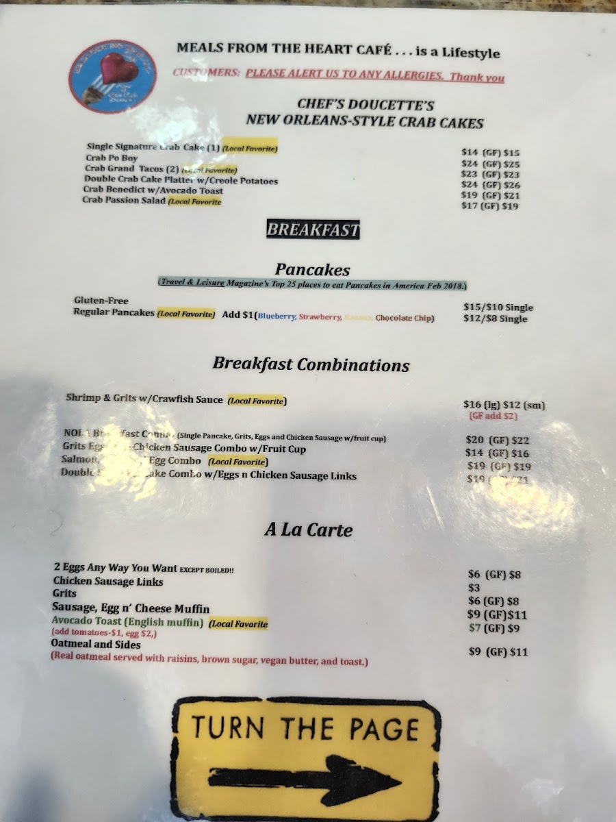 Welcome to the Meals From The Heart Cafe Menu, where every dish is crafted with care and love, right in the heart of New Orleans. Located at 1100 N Peters St #13, this cozy gem invites you to enjoy an array of flavorful meals that bring comfort and soul to your table. Whether you're in the mood for a classic Cajun-inspired dish or a hearty, home-style meal, there's something here for everyone. The menu is full of fresh, locally sourced ingredients, each one adding its own touch to the vibrant flavors that make this place so special. From satisfying breakfasts to mouthwatering lunch and dinner options, every bite promises a little piece of New Orleans magic. Expect friendly service, a relaxed atmosphere, and of course, meals that feel like a warm hug on a plate.